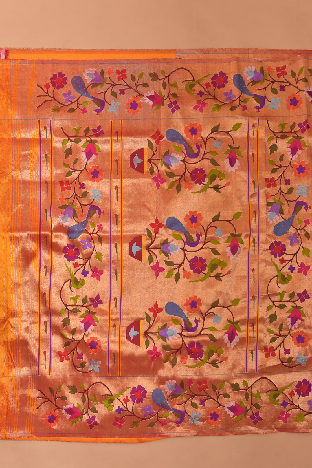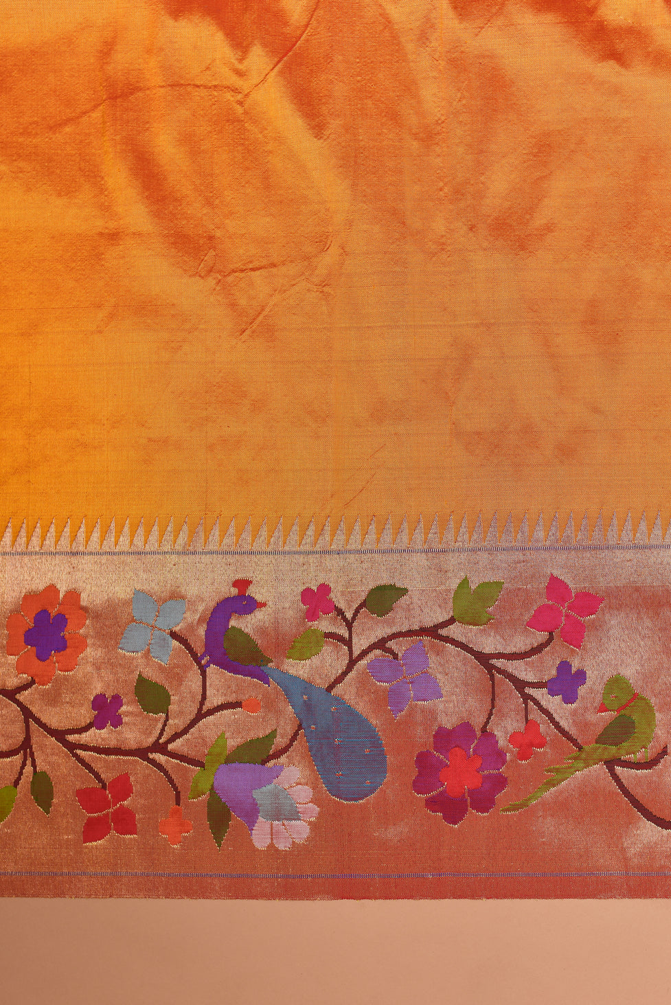 Details: Parrot, peacock, flower vel motifs on the border and pallu.